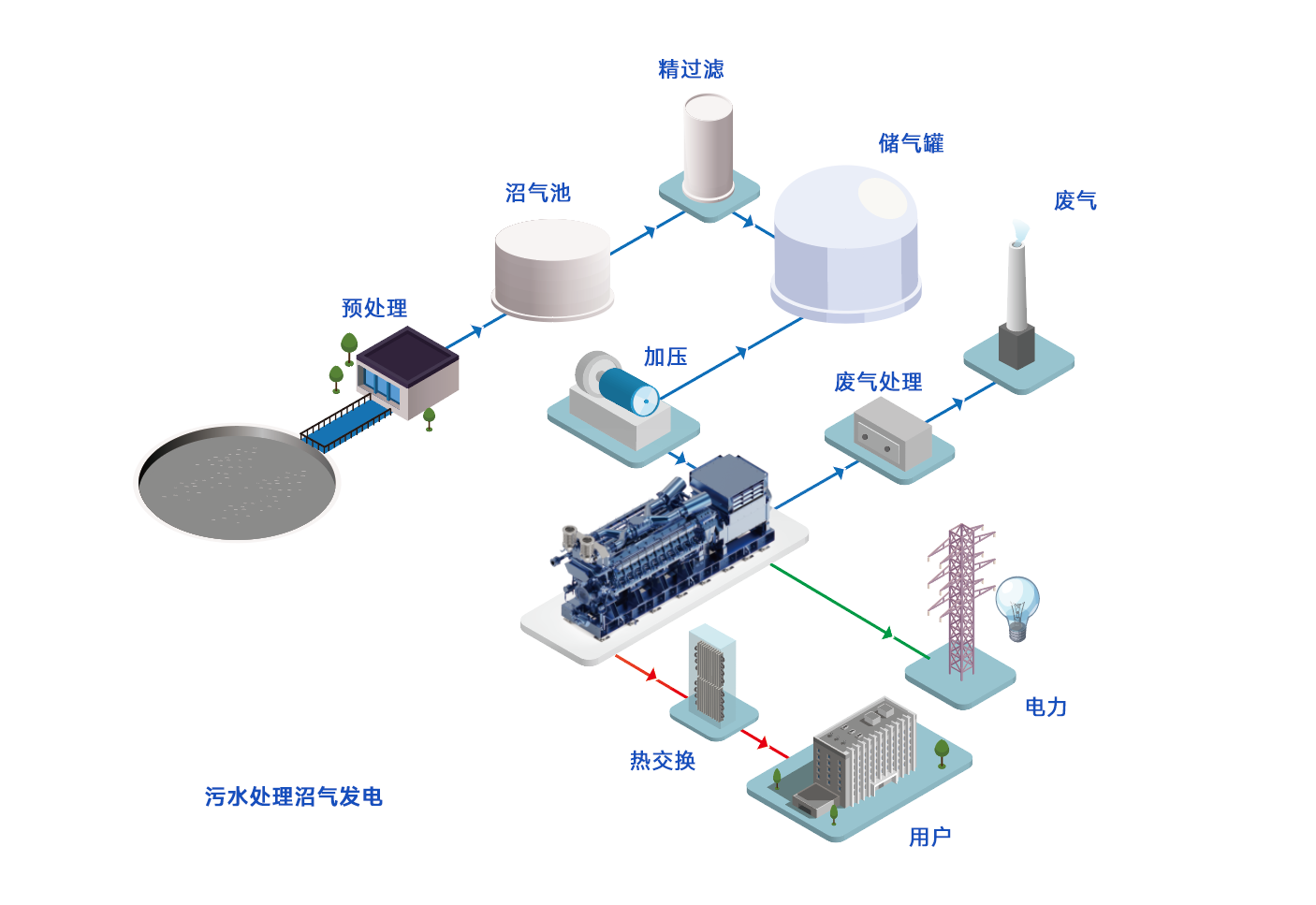 توليد الطاقة: يمكن استخدام الغاز الحيوي لتزويد مولدات الغاز الحيوي (المعروف أيضًا باسم وحدات الحرارة والطاقة (CHP) المدمجة أو وحدات التوليدات) لإنتاج الكهرباء والحرارة في وقت واحد.